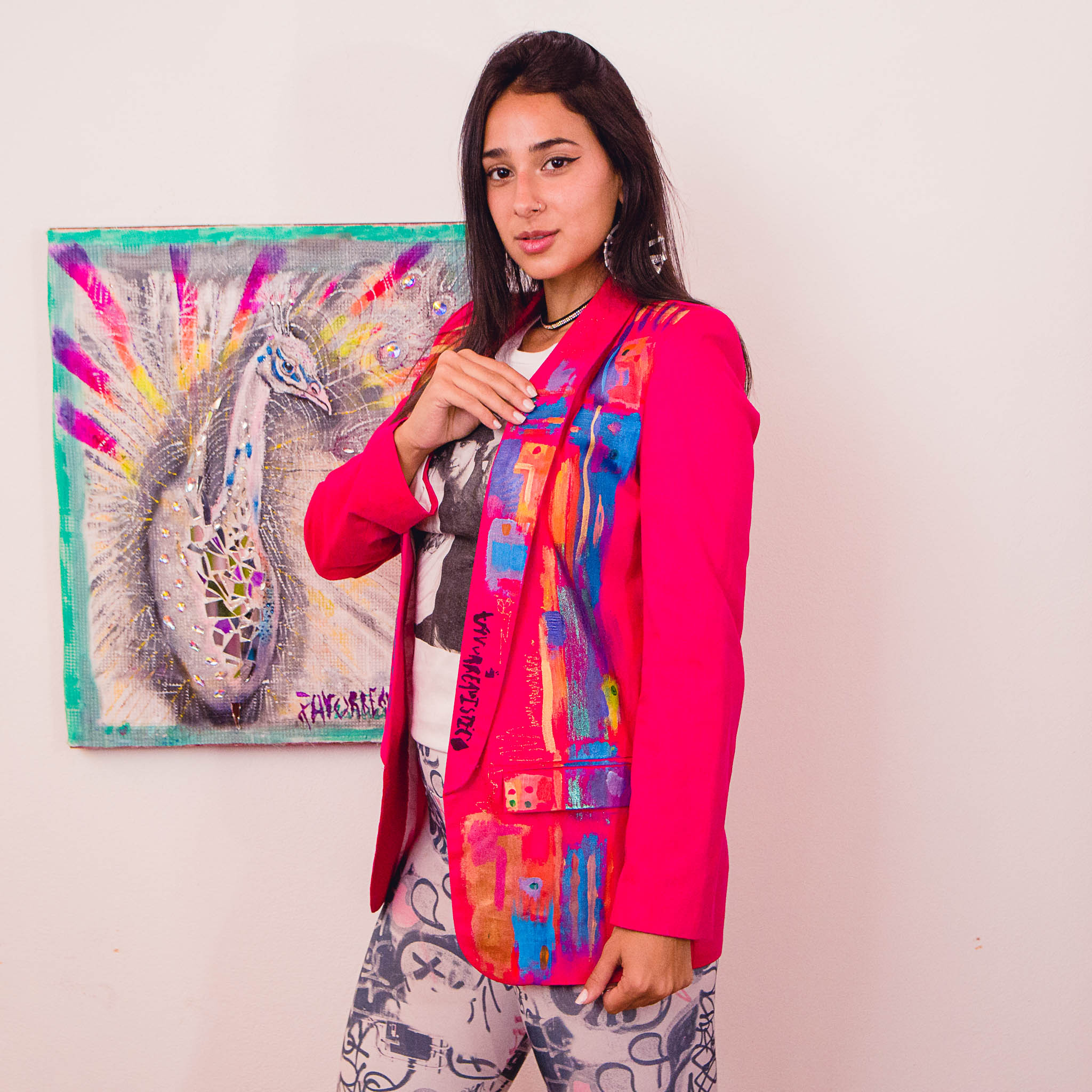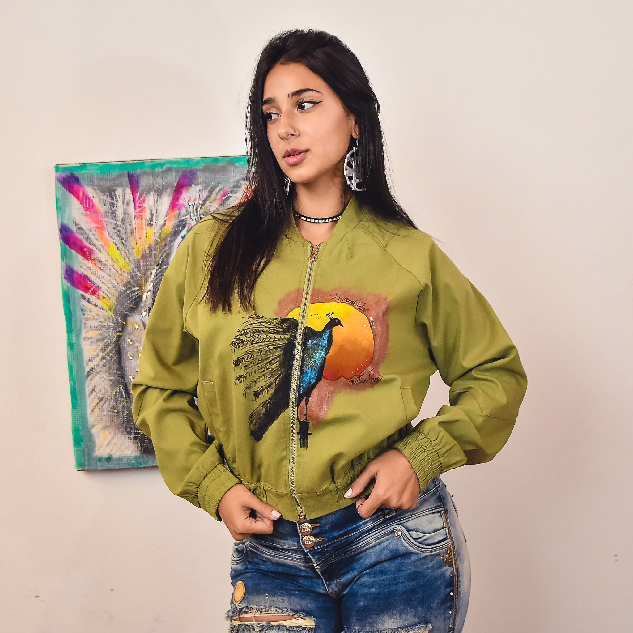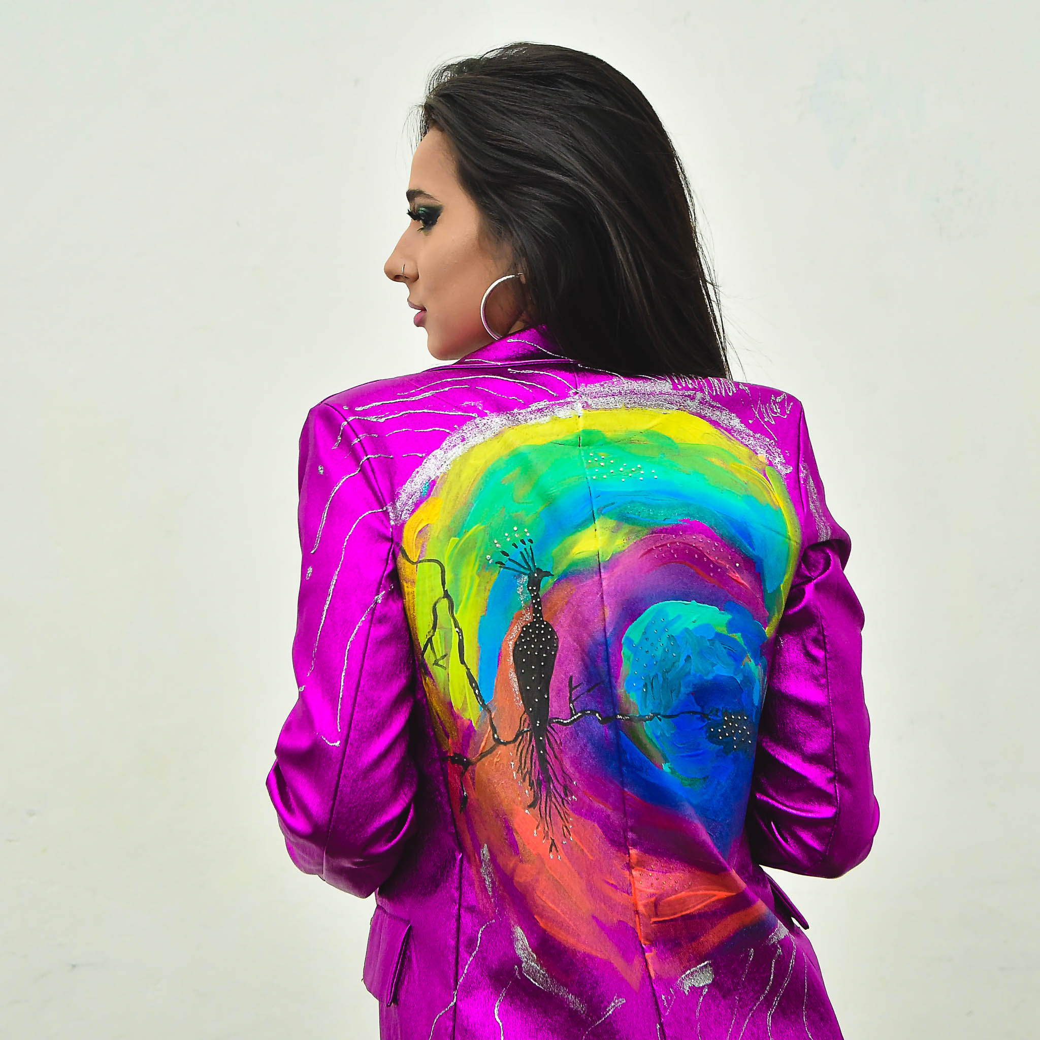 Saco metalizado, diseño espalda pluma pavo real.