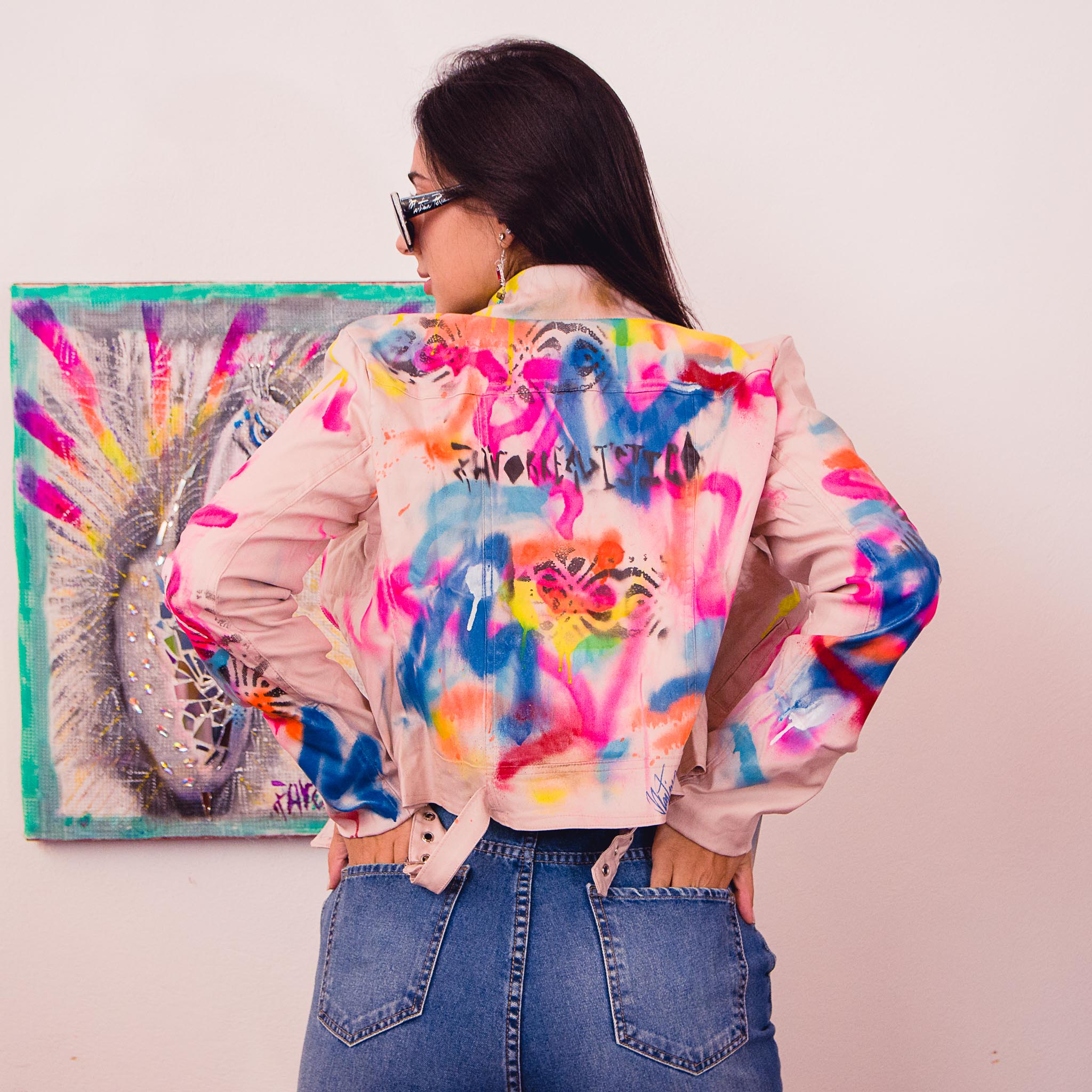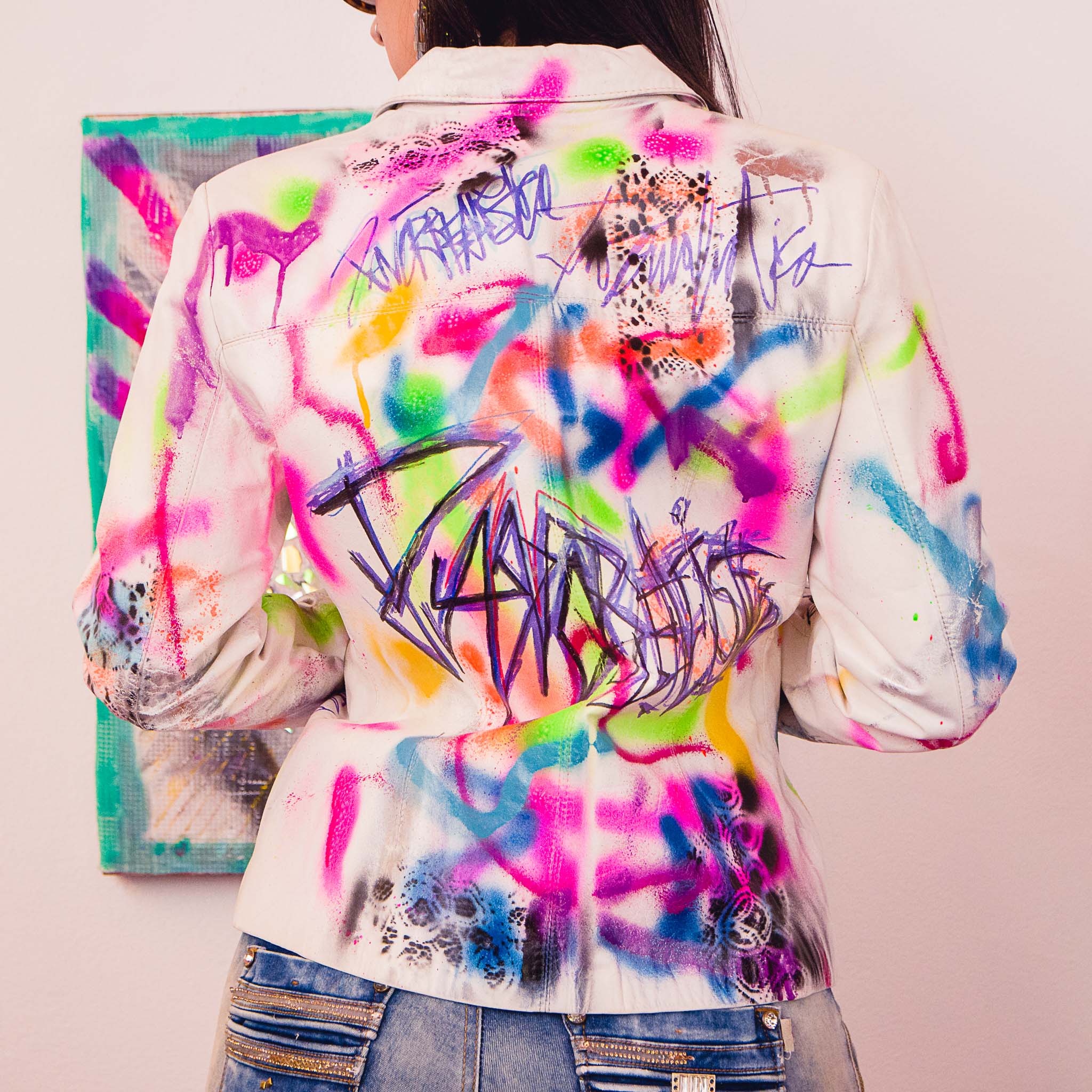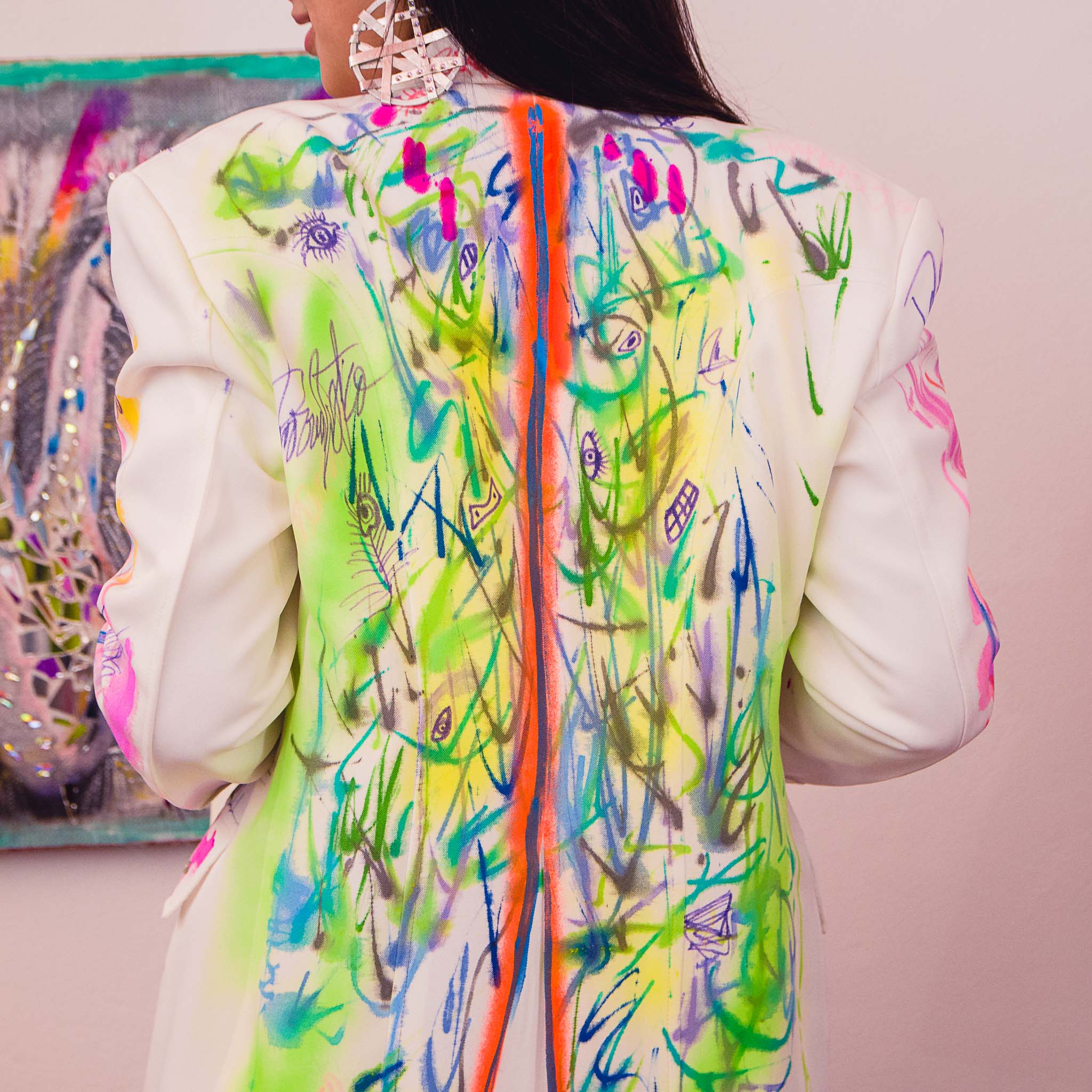 Saco metalizado, diseño espalda pluma pavo real.