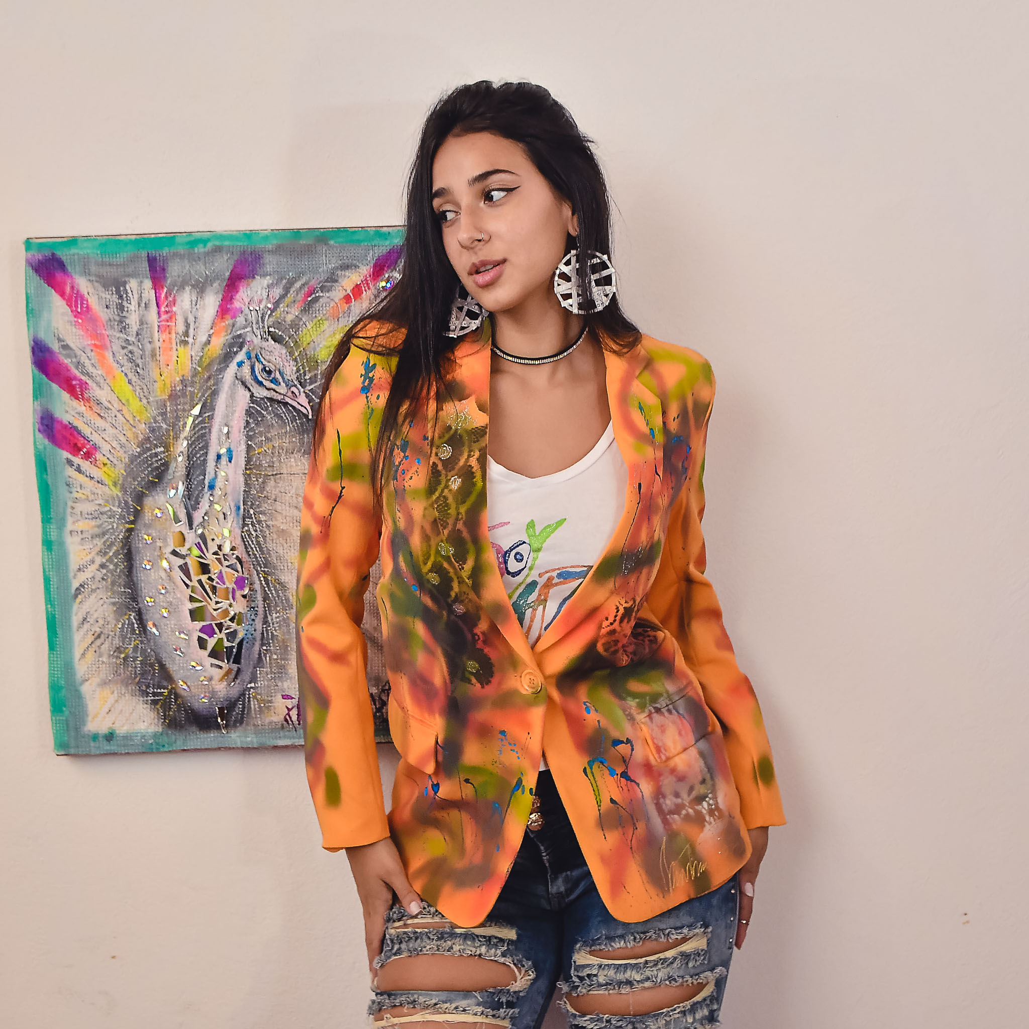 Blazer naranja diseño pavo real.