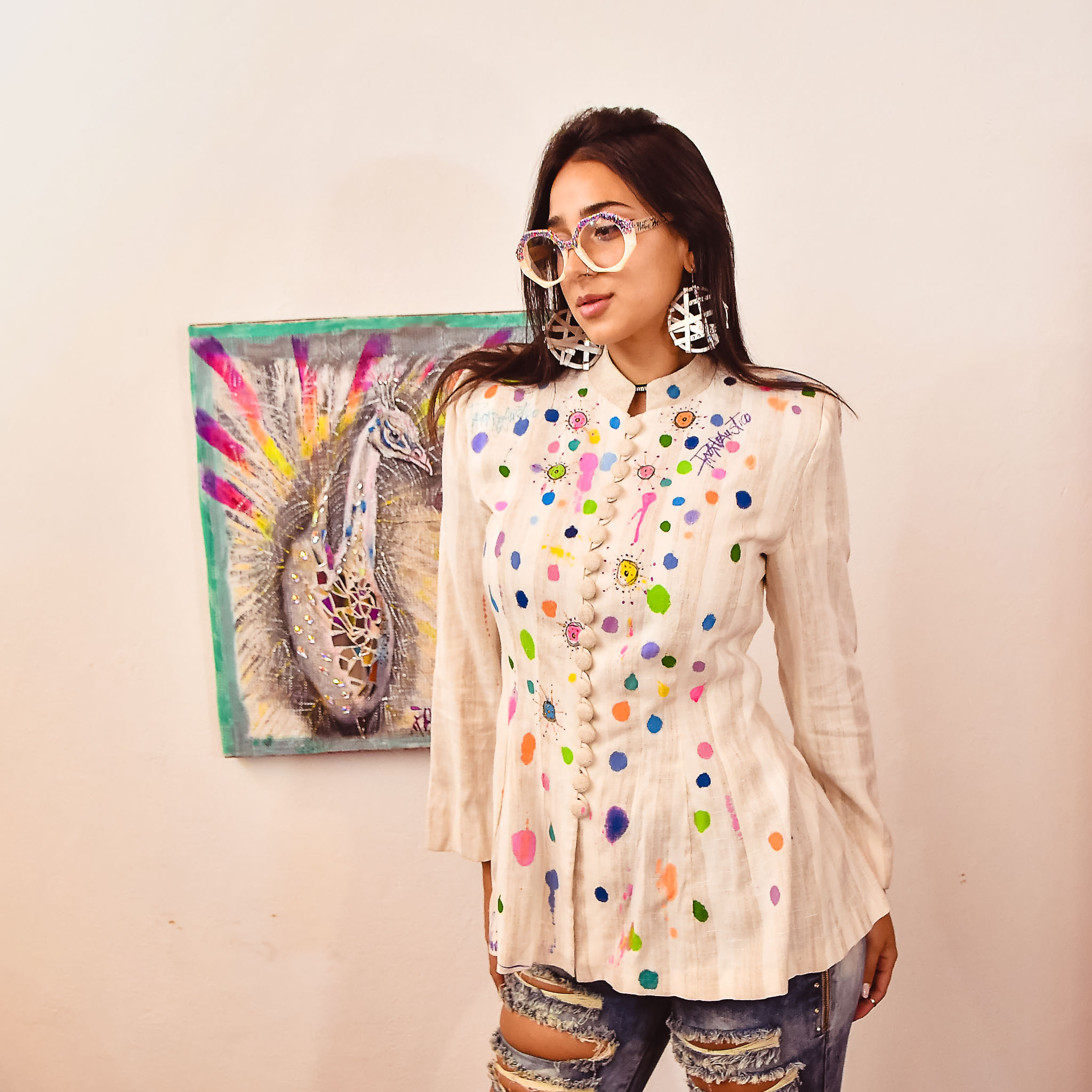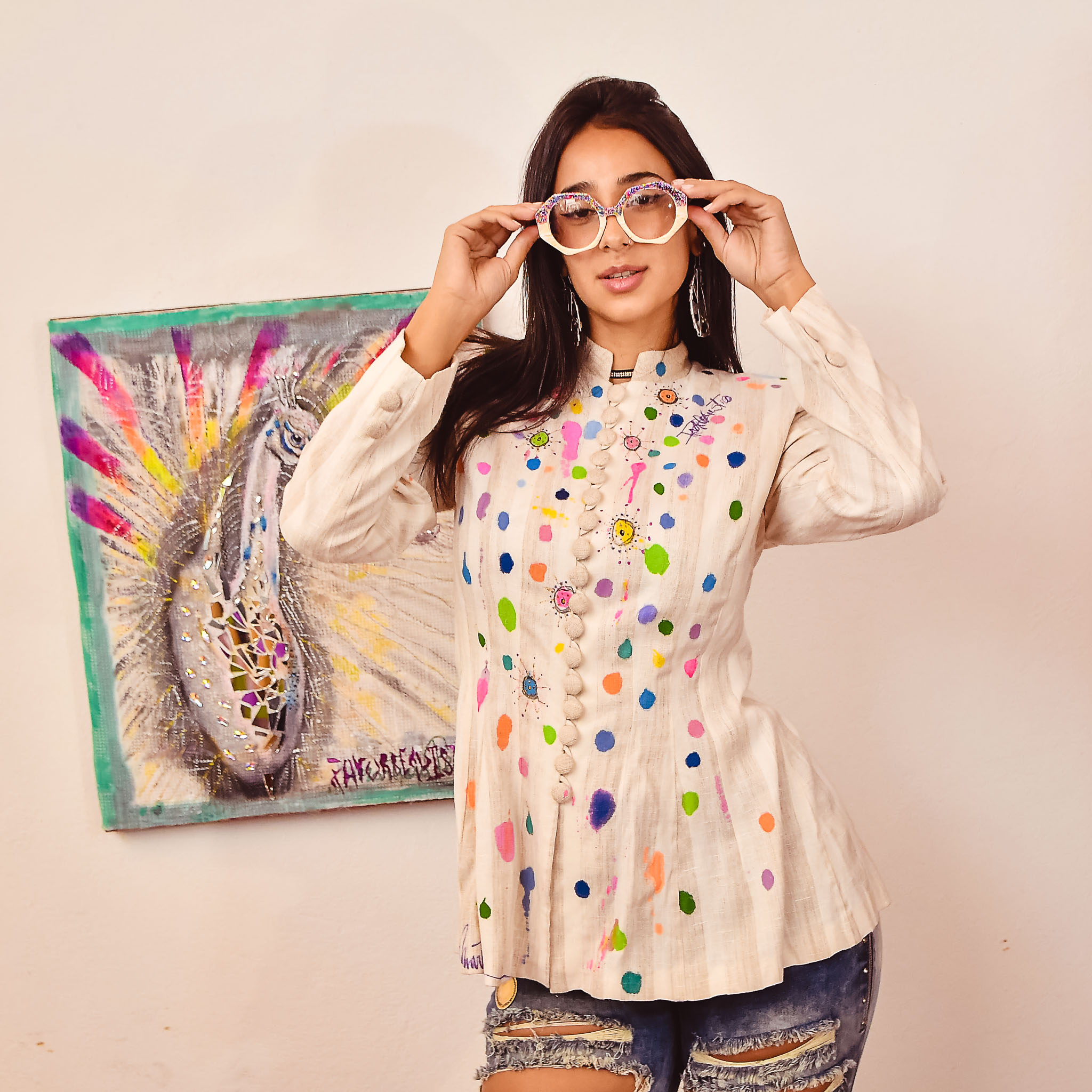 Saco lino diseño puntos de colores.